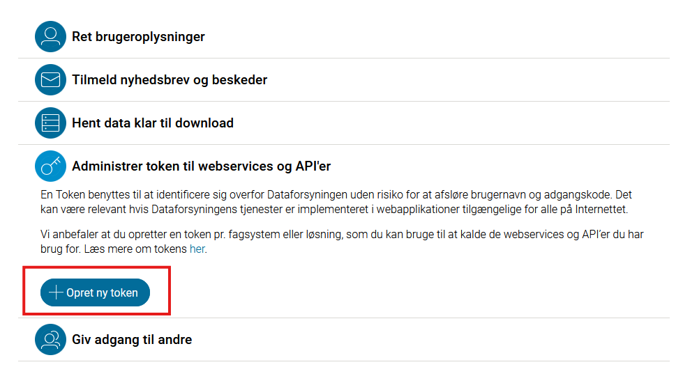 In order to access Geographical Web Services from dataforsyningen either directly as WMS etc, or through the QGIS plugin, you need a token A token is a long text code that represents a combination of username and password. One user can have many tokens and you can use them for different purposes If you think someone else is using your token you can delete that token and create a new one without having to change your username and password. To create a token login to dataforsyningen if you are not already logged in.