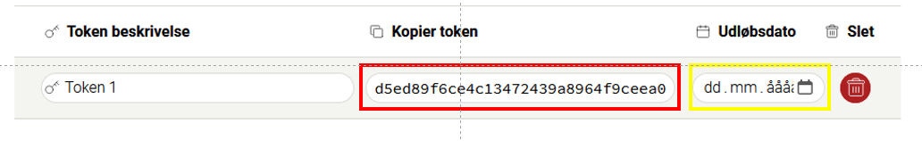 You will now be presented with your token administration page where you can see your token (re square) Delete a token (rec button) set a date where the toke is automatically deleted (yellow square) and finally to copy the token just click on it (red square)