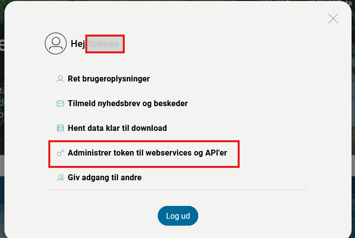 Click on your username in the top right corner (red circle) and then chose “Administrer token til webservice og API’er” (yellow circle)