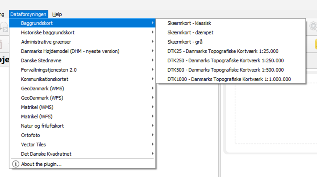 You should now have a new menu option in the top menu named Dataforsyning from which you can chose to load different data visualisations.